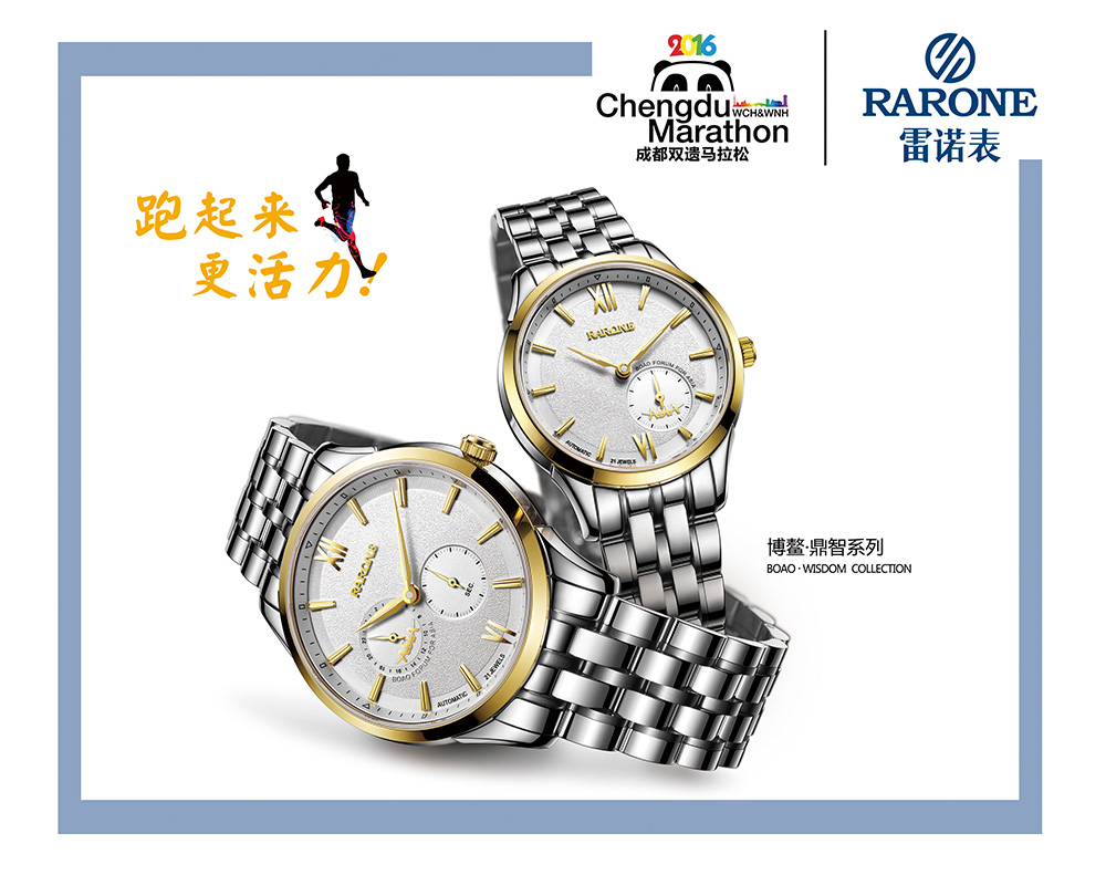 雷諾表作為商務手表領域的專業品牌,倡導職場人士8小時之外的健康生活,而跑步就是最簡單、最容易參與的運動方式。2016年3月,雷諾表牽手天府之國——四川,正式成為2016年“成都雙遺馬拉松官方指定計時用表”!