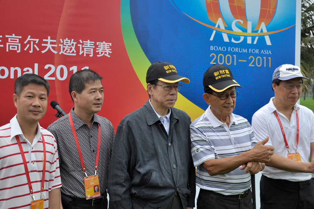 雷諾表業董事長詹西洲先生(左一)、總經理詹江洲先生(左二)與博鰲亞洲論壇理事長 日本前首相福天康夫(中);博鰲亞洲論壇前任前理事長、菲律賓前總統拉莫斯(右二)一同參加博鰲高爾夫邀請賽